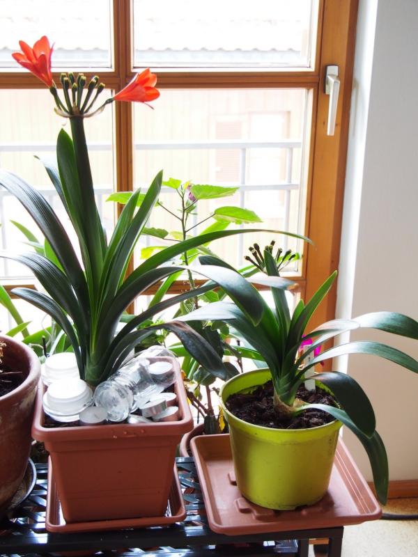 . Kossi hätte dafür sicherlich eine elegantere Konstruktion.Bei der kleinen Klivie würde ich das rechte Blatt, das schon nach unten hängt, abmachen. Die umgetopften Klivien bekommen aber doch keine direkte Sonne? Ich frage nur vorsichtshalber, weil auch ein Hibiskus am Fenster steht und der benötigt ja eher Sonne.Viele GrüßeElke