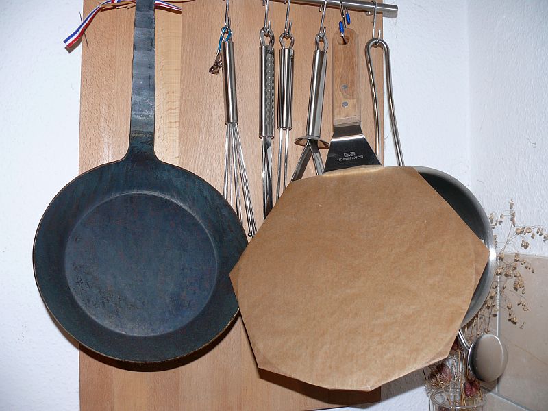 Für runde Brote verwende ich einen mit Backpapier bespannten Brotschieber, der