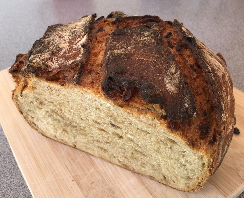 Das angeschnittene Brot wiegt ungefähr 1,5 kg, mein Gußeisentopf mit Deckel ist groß genug für 2 - 2,5 kg-Brote.