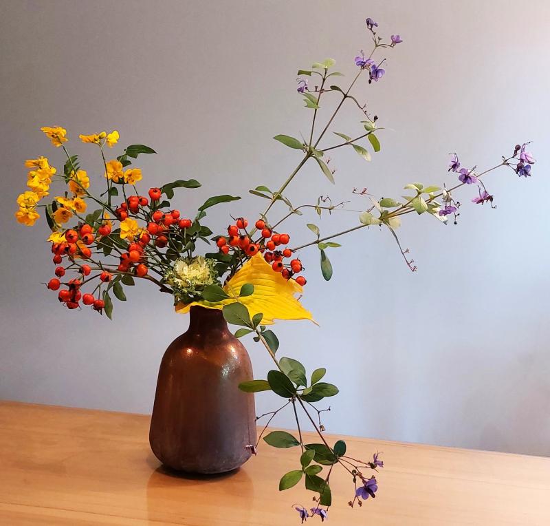 Zum Einräumen werden die Kübelpflanzen zurückgeschnitten. Das fällt mir beim Blauflügelchen (Clerodendrum ugandense) schwer, aber sonst reicht der Platz nicht und auch in der Vase ziehen die Blüten die Blicke auf sich. Dazu gelbe Cassia (C. corymbosa), von der immer wieder genug Triebe anfallen.