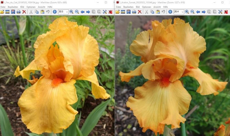 Blöderweise ins selbe Beet gesetzt wie Feu du Ciel und dann die Bilder der letzten Wochen immer mit Feu du Ciel betitelt bis ich gestern das Schild gesehen habe. Ja manche Schilder sind da wo sie sein sollen. Nun habe ich Schwierigkeiten von welcher die vorherigen Fotos waren. Sicherheitshalber also mal eion altes Bild rausgesucht für einen Vergleich. :P Hier also links 'Feu du Ciel' und rechts 'Avalon Sunset'