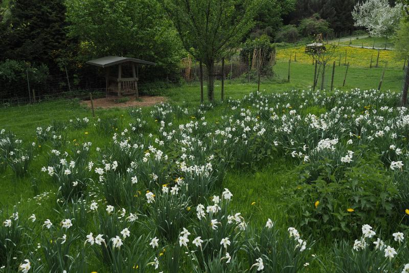 Die einzige Behandlung ist, dass ich wenn die ersten Narzissen aus der Erde spitzen, die Fläche schafsicher einzäune und dann erst sehr spät die Fläche mit der Sense mähe wenn alles eingezogen ist. Das gute ist, dass vor dem Einzäunen die Rasenfläche richtig kurz ist und so die Narzissen nicht in Gräsern oder Schafsgarbe untergehen. :)