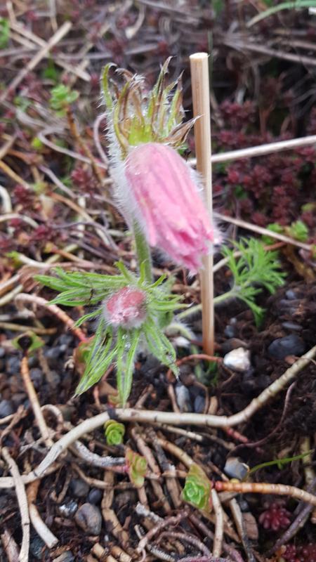 Eine rote, im Vorjahr gepflanzt, hat sich ausnahmsweise mal gut entwickelt. Von der werde ich Samen abnehmen. Bisher blüht hier keine andere Küchenschelle.