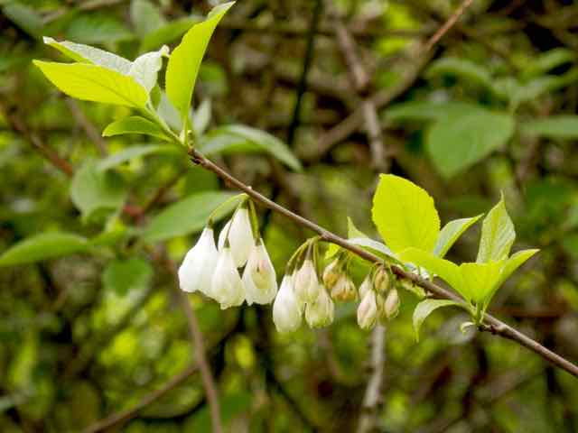 Der mittlerweile über fünf Meter hohe Schneeglöckchenstrauch Halesia monticola beginnt wieder zu blühen: