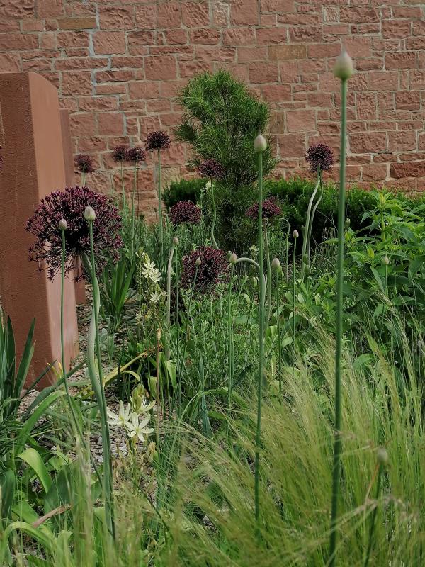 Richtig begeistert mich Allium "Miami" Dunkel und borstig nach oben stehend auf dicken Stielen. Hier in einer öffentlichen Pflanzung im 2. Jahr.