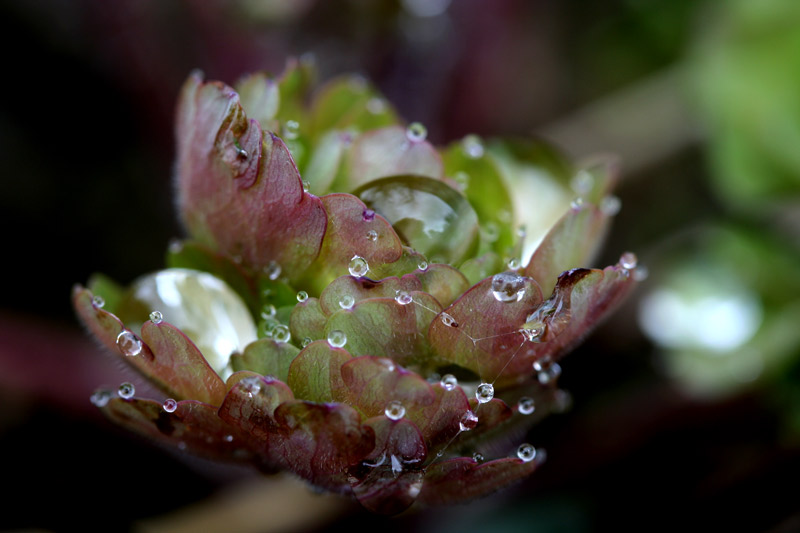 was mir am makro gefällt, dass physikalische phänomene wie die oberflächenspannung so gut zu sehen sind. der tropfen sinkt nicht ganz in die blattkuhle ein: