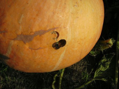Als ich das letzte Mal auf unserem Kürbisacker war, sah ich, daß in einen Kürbis 3 Löcher gebohrt waren und in eins war ein Feuerwerkskörper gesteckt. Vor diesem haben wir einen Sichtschutz durch Topinambur und trotzdem.... Es ist doch nichts mehr sicher. Zum Glück ist es keiner unserer Wettbewerbskürbisse