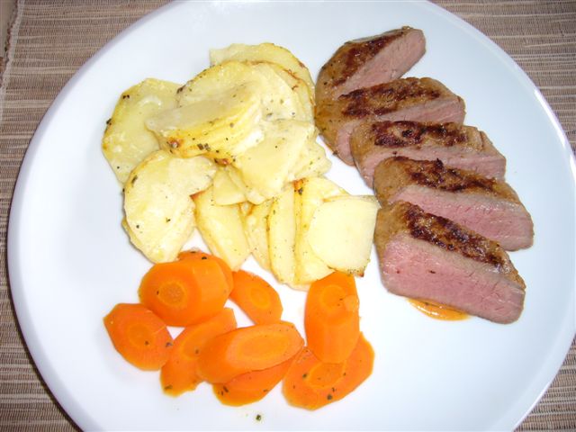 Bei mir gab es gestern: RuccolasalatSpargelsuppeLammrücken auf Cognac-Sauce, Kartoffelgratin, Rüebli (Karotten)