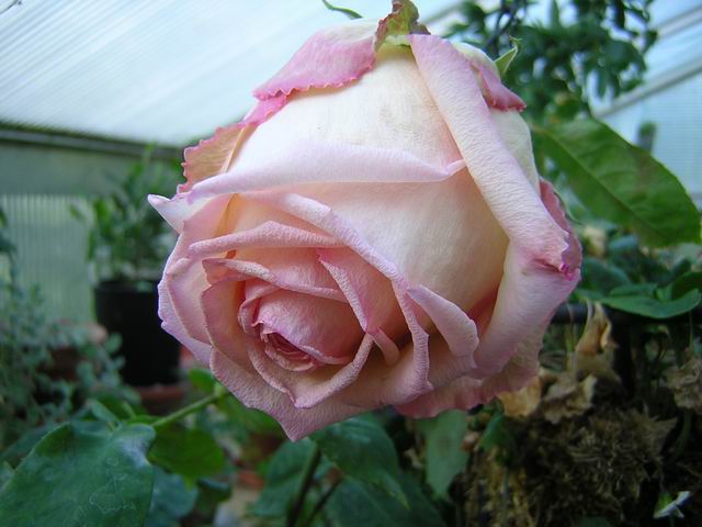 Seit ein paar Tagen blüht Mme Laurent Simons (Leveque 1894) mit schweren nickenden Blüten. Dickerson zitiert nur eine Beschreibung aus dem Journal des Roses und nach dieser hat sie fast alle Rosenfarbtöne : "color: coppery pinkish yellow nuanced chrome red and tinted blush pink. Sometimes the plant will bear coppery red blosssoms shaded yellow."