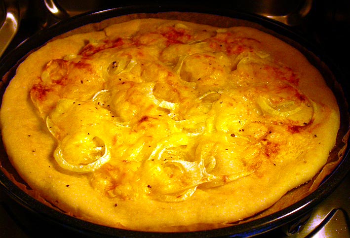 Frisch aus der Mikrowelle... RoseBettys leicht geänderter Flammkuchenteig als Mittelding zwischen Flammkuchen und Pizza, mit Olivenöl, Zwiebelringen und Käse gebacken.