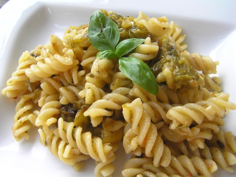 es gab nudeln mit ofentomatensoße und olivenpaste mit reingerührt. das waren jetzt die allerletzten eigenen tomaten aus dem tiefkühler. grüne - deswegen auch die eigentümliche farbe.