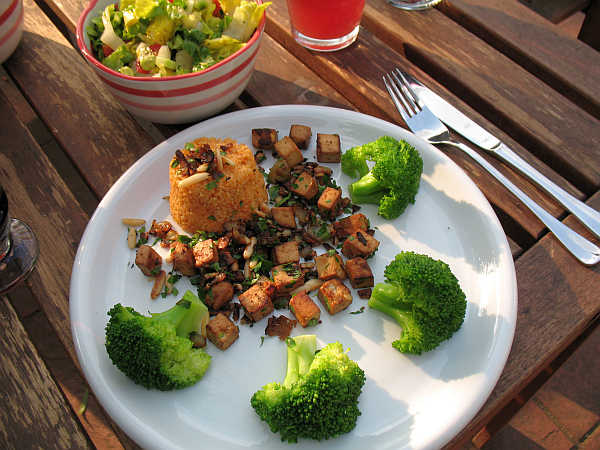 Gestern waren wir in einer Tapas.Bar: gegrillter Seehecht, Krake, Ofengemüse, Schafskäse mit Serrano, köstliches Aioli, gebratene Auberginen, Zucchini und Paprika, geschmorte Champignons, Sardinen, Oliven und köstliches Brot. Und ich Depp habe den Fotoapparat vergessen.Heute gab es Quinoa-Hirse mit brokkoli und gebratenen Tofuwürfeln mit Zwiebeln, Knoblauch und Pinienkernen.