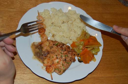 ), aber es soll ja sooo gesund sein. Deshalb also: Couscous, gehobeltes Herbstgemüse und Wildlachs (für die Erwachsenen) bzw. Garnelenspieße (für die Kinder).