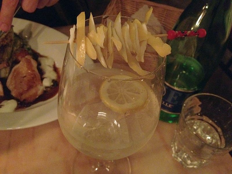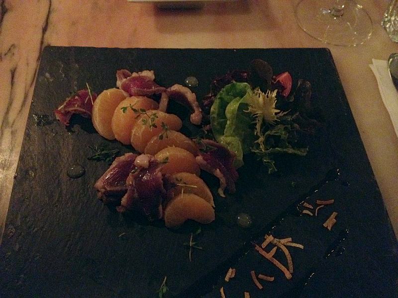 es gab geräucherte nantaiser ente, mandarine und kresse, dazu gewürztraminer...