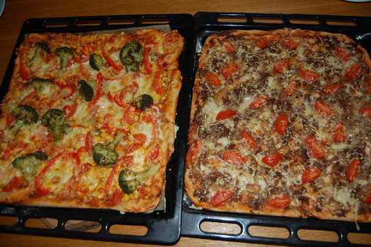 Heute gab es zweierlei Pizza: Links die vegetarische Variante mit Mais, Broccoli, Paprika, Tomate und Mozarella. Rechts eine Hackfleisch-Champignon-Pizza.