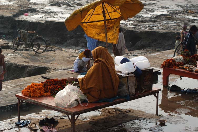 Blumenverkäuferin. Man setzt kleine Schälchen aus gepressten Blättern mit angezündeten Kerzen und / oder Blüten in den Ganges ...