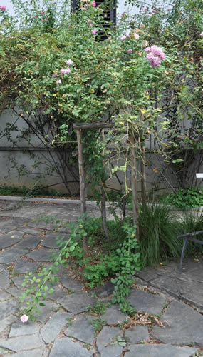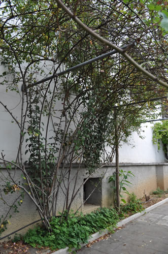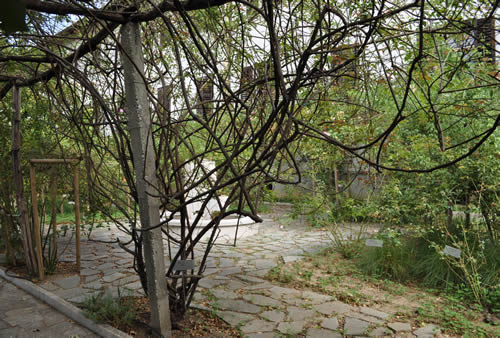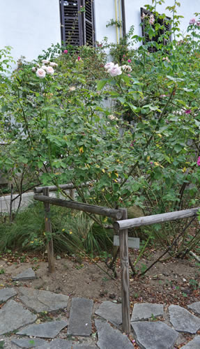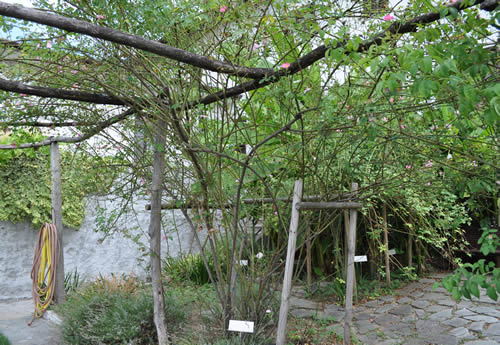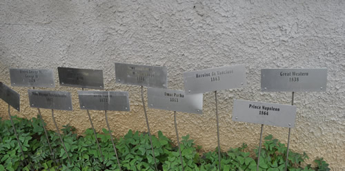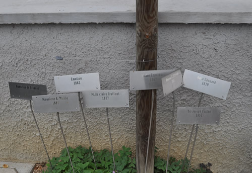 Schilder an der Wand.Für noch zu pflanzende Rosen, oder von Rosen die abgegangen waren, - wir haben es nicht herausgefunden.Leider waren alle Schilder sehr schwer zu fotografieren, da sie stark spiegelten. Sind halt nicht zum Ablichten gemacht worden!