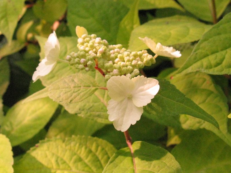 Verändert sich denn die Blüte später bei Dir auch ins Rötliche?Links sieht man auch die Wand mit der Kletterhortensie...