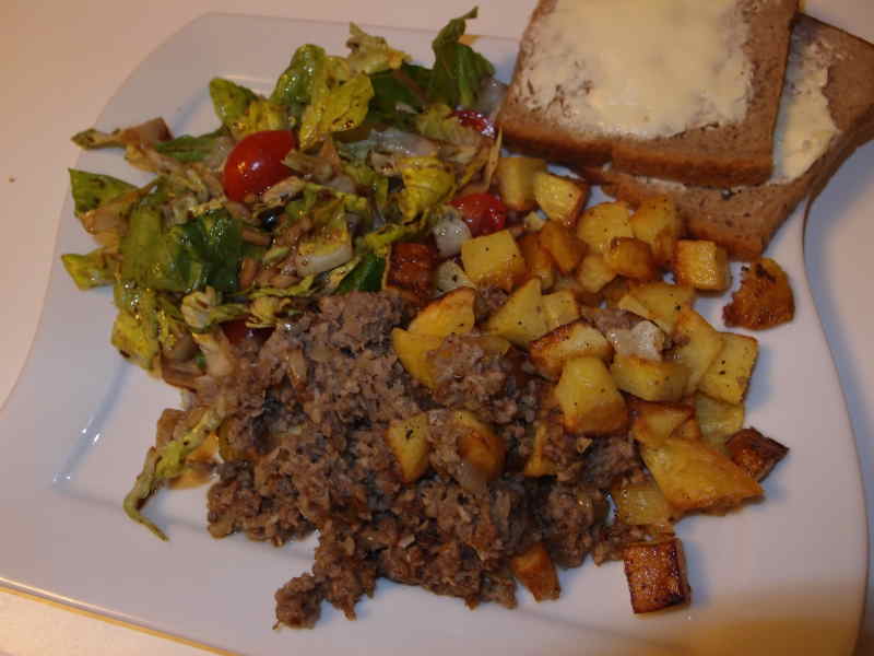 ) mit bratkartoffeln aus rohen kartoffeln und eine einsame leberwurst aus dem tk zusammen mit zwiebelwürfeln angebraten. butterbrot gabs auch noch dazu.