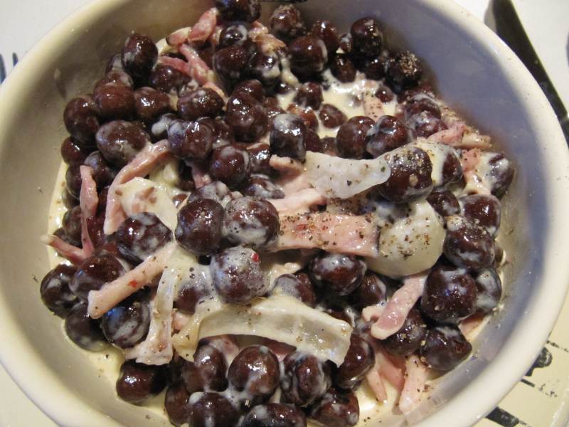 Als Hauptgericht wählte ich etwas Lettisches: Grauerbsen mit feinen Schinkenstreifen (geräuchert und gekocht) und zarten Streifen von Kohlblättern, alles abgerundet mit saurer Sahne (die Letten lieben saure Sahne!). Später sah ich nach, was denn Grauerbsen sein könnten, und siehe da: es sind Kapuzinererbsen.