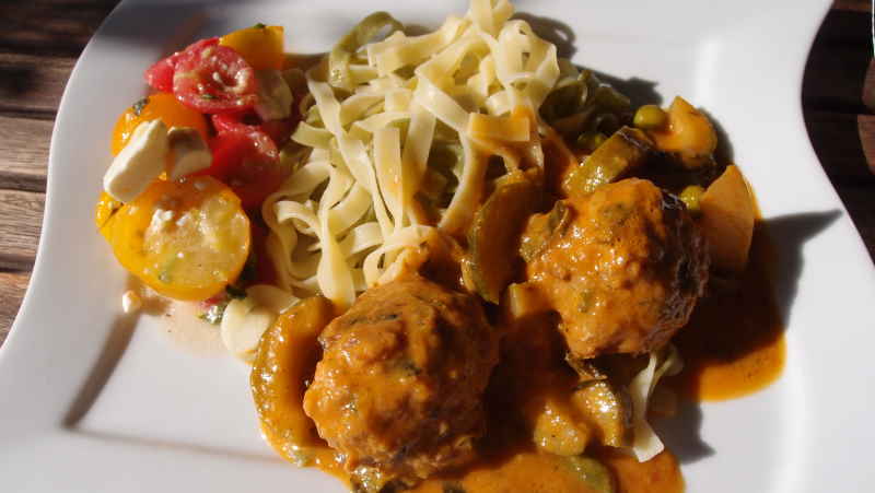 und heute hackfleischkugeln in paprikasoße mit zucchini, paar frischen erbsen und ersten bohnen mit drin. dazu bandnudeln und den rest vom salat vom vortag.