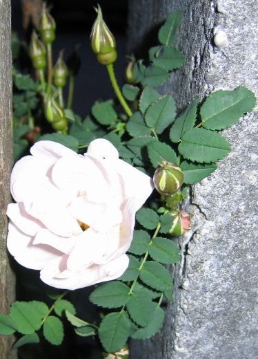 Oh.... hallooooo....ich bin richtig aufgeregt! Nie im Leben haette ich damit gerechnet, aber bei uns in bayerisch Sibirien ist heute die erste "natuerliche" sprich nicht durch das gewaechshaus gepuschte Rose aufgegangen. Die anderen schlummern alle noch in festen Knospen und diese haette ich fast uebersehen, weil sie sich ganz unten windgeschuetzt eingeklemmt zwischen Zaunpfahl und Latte geoeffnet hat! Eine "Pimpinellifolia Hybride". Noch etwas blass um die Nase - sie ist eigentlich zart rosa...Rosige GruesseSabine