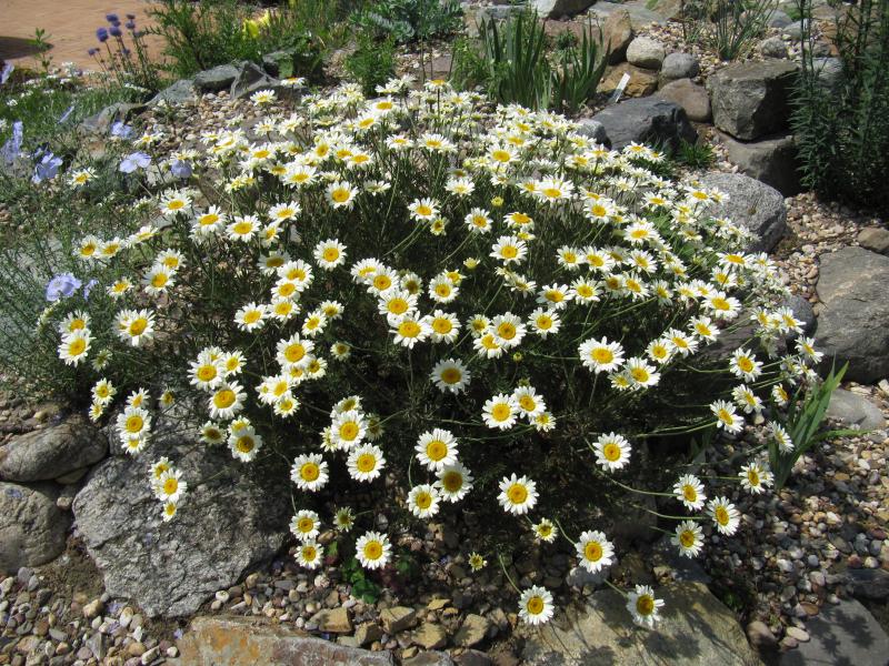 Anthemis tinctoria ‘Sauce Hollandaise' kam offensichtlich gut genährt hier an (erst im Frühjahr gepflanzt).