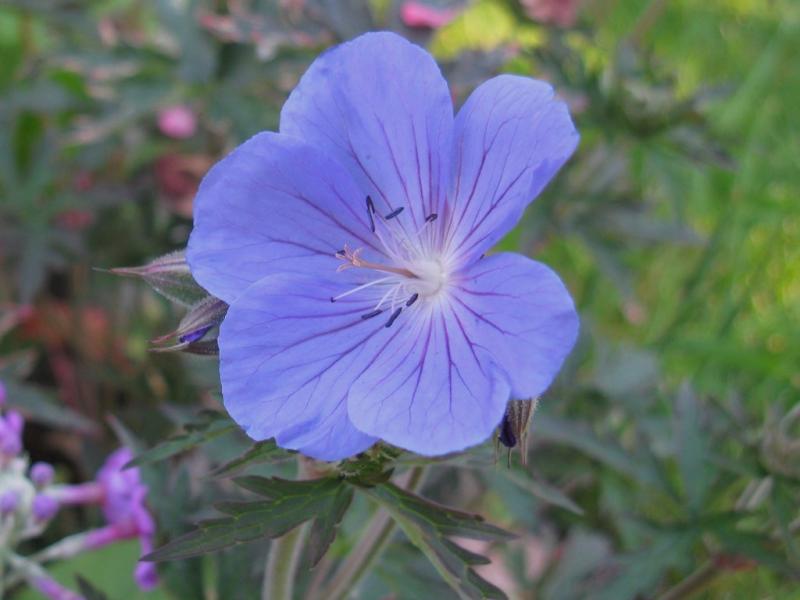 Der erste Sämling von 'Victor Reiter' der hier blüht. Er erreicht einen Blütendurchmesser von gut 4 cm.Größer jedenfalls als ich dies bei dem Original je festgestellt habe. Ein weiterer Nachkomme mit einer sehr vielblütigen Knospe steht in den Startlöchern. Er ist auch starkwüchsig wie viele grünlaubige G. pratense.Den weiß blühenden Sämling finde ich trotzdem immer noch allerliebst.