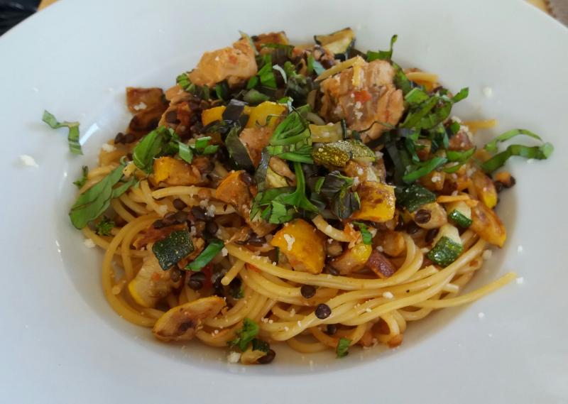 Spaghetti mit Belugalinsen, gebratenen Zucchini und Lachs, dazu Frisee mit Radieschen.
