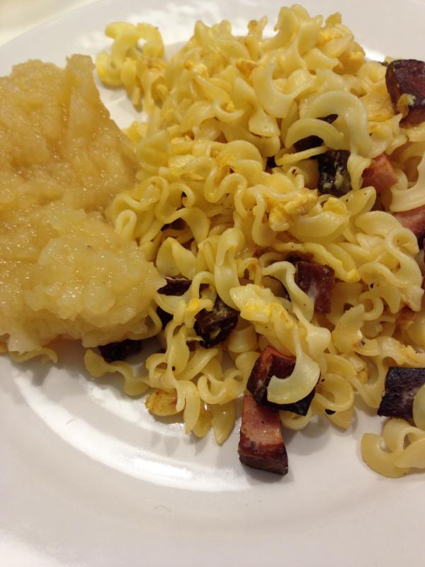Bei uns gabs fleischkäsenudeln mit apfelbrei
