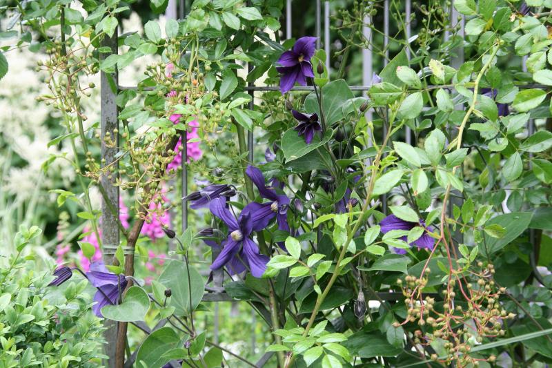 Die Durandi ist ja eine Staudenclematis, die brauchen immer Stützen. Die haben ja keine Kringel zum festhalten. Ich binde sie einfach am Rosenbogen fest, nicht einzeln sondern in der Fläche. Sie kann sich dann auch an der Kletterrose stützen. Wenn Du genau schaust, dann siehst die grünen Bindfäden.