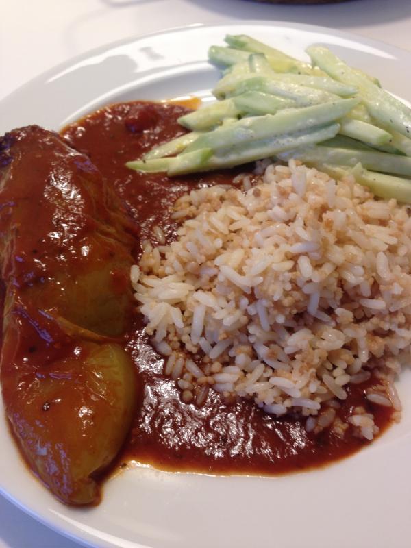 Hier gabs tk-Reste. Türkischer Reis und gefüllte Paprika. Achja und Gurkensalat