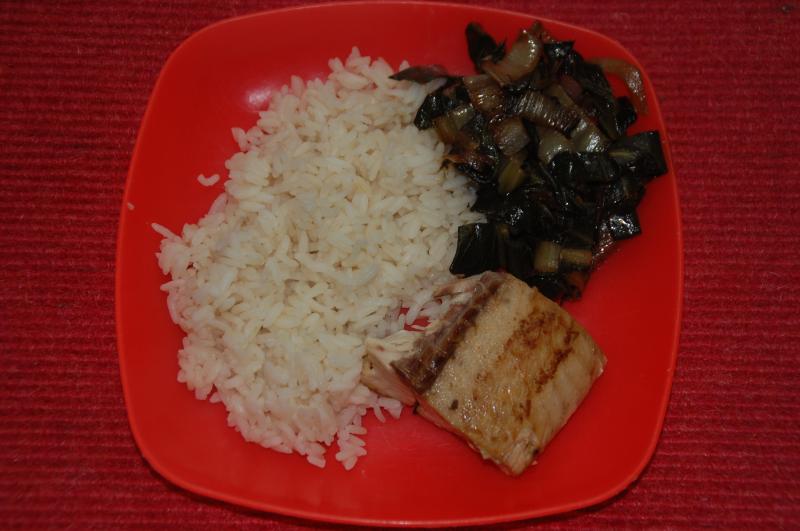 Hier gab es Lorbeerreis mit Mangold und gedünstetem Wildlachs.