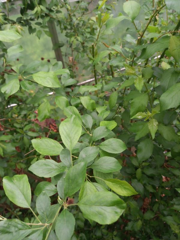 Kleine Blätter und Früchte (und ein bisschen Dornen) hat allerdings auch die Sorte 'Apyrena' = 'Kernlose', dafür eben keine Kerne in den Früchten. Zum Vergleich, die Kultursorten von mir haben ungefähr Aprikosengröße, die 'Apyrena' eher Hagebutten- bis Kirschgröße.