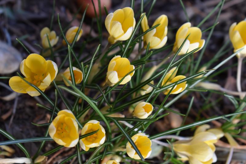 Man kann es auf den Fotos nicht ganz eindeutig erkennen, aber wenn die innen sattgelb und außen hellgelb sind, dann dürfte es Crocus chrysanthus 'Romance' sein, der ist bei mir sehr wüchsig und reichblütig. Ist oft in den Mischungen "botanische Krokusse" aus dem Supermarkt oder dem Gartencenter drin.