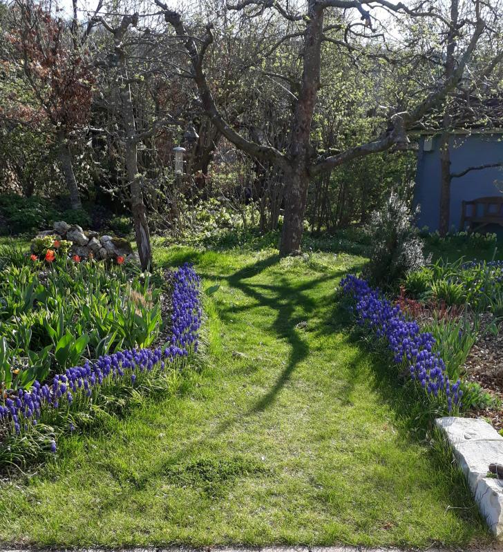 Die Muscari am Beetrand haben eine gute "Nebenwirkung": sie halten die Rasenkante auf Abstand, beinahe so, wie es früher der Bux tat. Nach der Blüte werden sie gemäht und gut ist's.