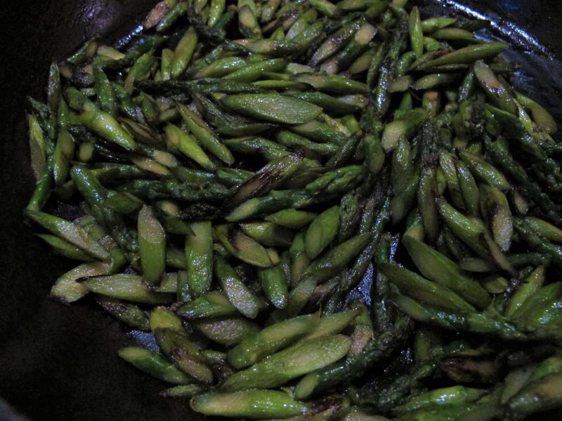 Hier gab es Grünspargelrisotto mit Lachs. Der Spargel war ganz zart und ließ sich super braten, sachte. Das Interessante daran ist die Alchemie: Am Ende hatte sich das Volumen auf ein Drittel reduziert, was den Geschmack erheblich intensiviert.