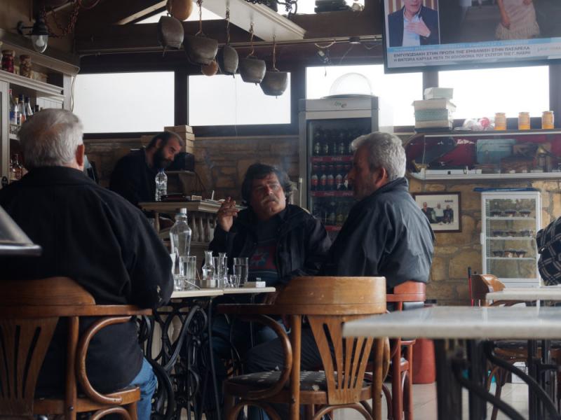 Auf der Hochebene Gious Kambos war es regnerisch und biestig. So fuhren wir weiter nach Gerakari und kehrten im Kafenion Apsida ein, dessen Wände mit alten Gerätschaften dekoriert sind.