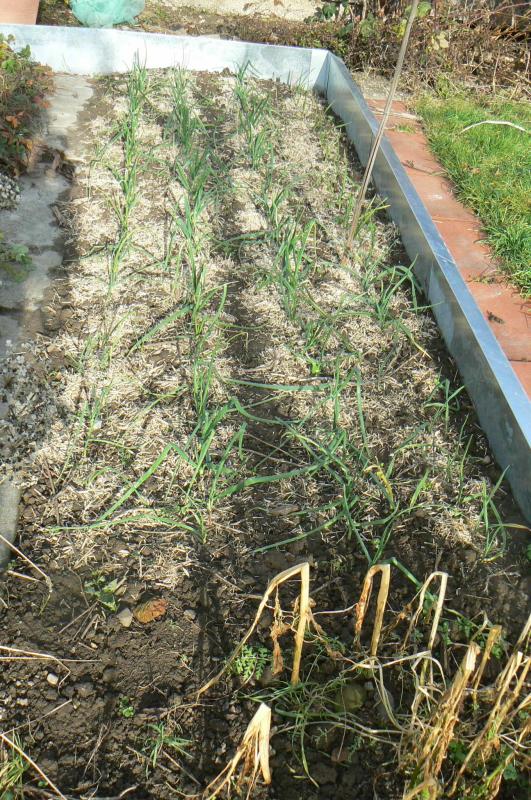 Der Knoblauch steht ganz rechts am Schneckenzaun. Ich habe dieses Jahr erstmals zur Hälfte die Sorte Germidour gepflanzt.