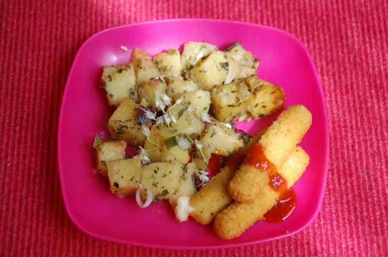 Hier gab es Kräuterkartoffeln (Kartoffeln, rote Zwiebel, Frühlingszwiebeln, Thymian, Zitronenmelisse, Oregano, Majoran, Estragon, Salz, Olivenöl) mit (bzw ohne) Mozarellastick und Chilidip. Deko: Zwiebelblüten