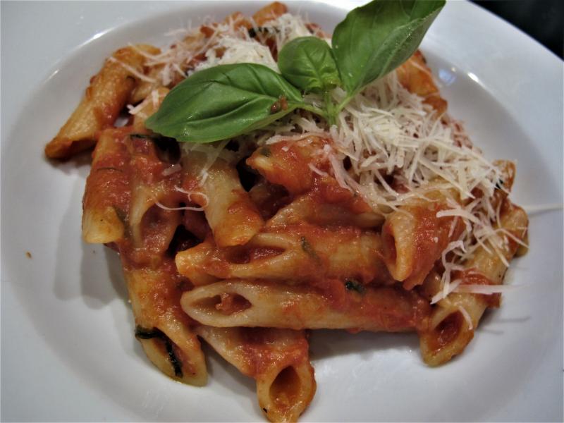 Hier gab es Rigatoni mit Tomaten (von der gestrigen Großaktion), Butter, Basilikum und Parmesan, dazu Endiviensalat.