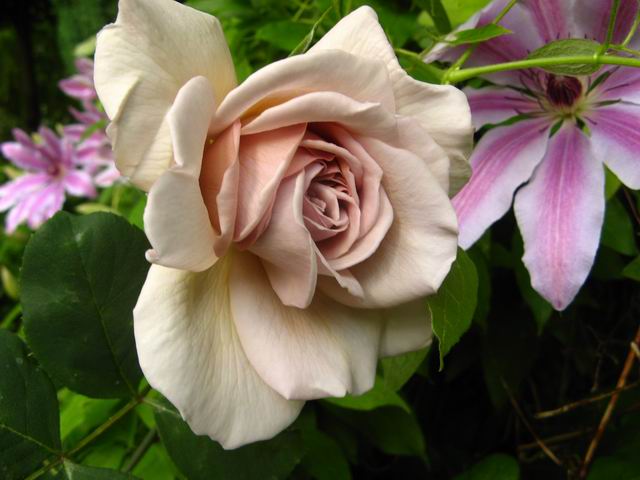 Eigentlich keine gute Farbverbindung,aber auf dem Foto gehts.'Grey Pearl'mit Clamatis Nelly Moser.Grey Pearl hatte ich mal massenvermehrt und einige auch waaghalsig ausgepflanzt. 8) :-X Nun,die gab es im Freiland dann nach dem Winter nicht mehr,aber dieses Foto ist noch erhalten.