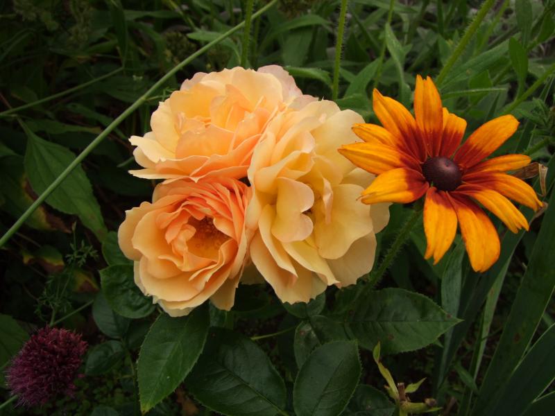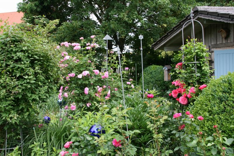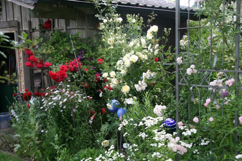 :D Die rote Kletterrose Heinfels, links daneben die Austin Rose The Pilgrim. Die wird jedes Jahr so groß, das wäre auch eine wunderbar duftende Kletterrose, sie blüht wirklich den ganzen Sommer.