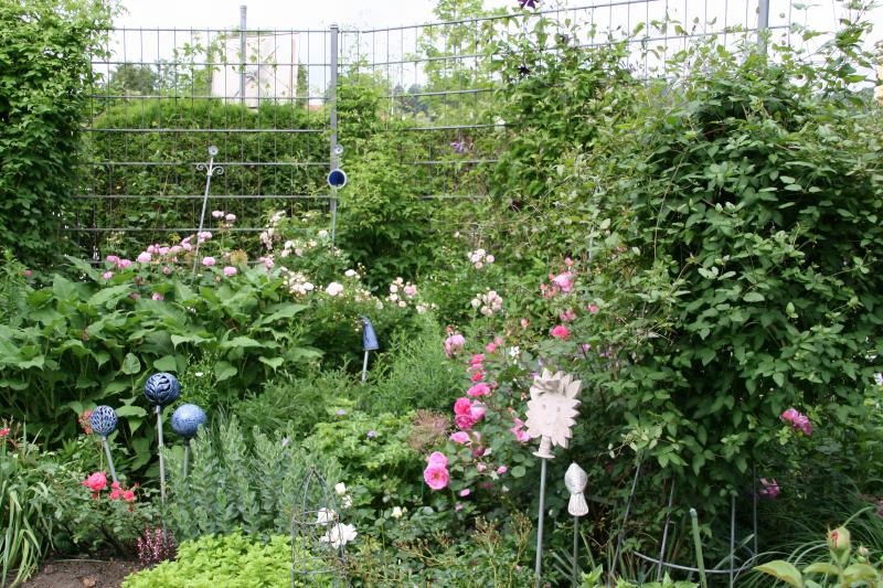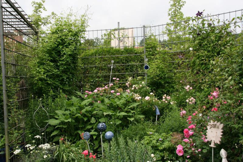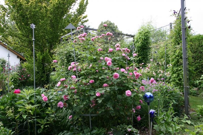 Die Louise Odier die ich 3mal habe, das würde ich jetzt auch nicht mehr machen, 3 gleiche Rosen. Wenn man bedenkt da hätte ich noch 2 andere Sorten kaufen können, wenn ich nur 1 Louise gekauft hätte....... Das sind echte Sorgen ;). Aber die ist so schön grün, habe heute einen Gartenrundgang gemacht und das wieder festgestellt. Dieses Beet habe ich 2019 umgemodelt. Habe den Knöterich rausgenommen und noch etliches anderes. Da ist im Hintergrund eine Louise, die will ich jetzt als Kletterrose ziehen. Das Gestell bietet sich dafür gut an. Sie wird dann eingerahmt von links Cl.vit.Emilia Plater (hellblau(, rechts Cl.vit.Huldine (weiß), das sieht bestimmt gut aus. Der Knöterich hat ihr richtig die Luft weggenommen. Dachte ja nicht, das der so wuchert.