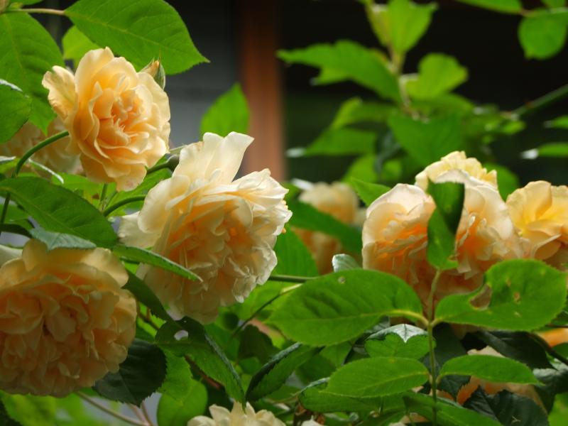 'Buff Beauty'durchs Gestrüpp abgelichtet.Die ist hier erstaunlich winterhart.Vielleicht weil sie auf der nördlichen Hausseite steht und kaum volle Sonne abbekommt?