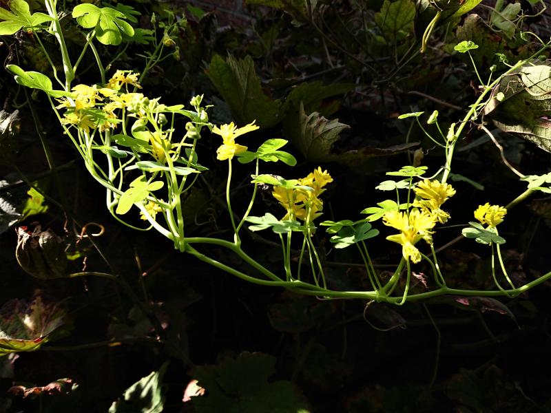 Eigentlich sollte Tropaeolum peregrinum die blauen Trauben kontrastreich durchweben. Nur gibt es dieses Jahr kleine blauen Trauben!?