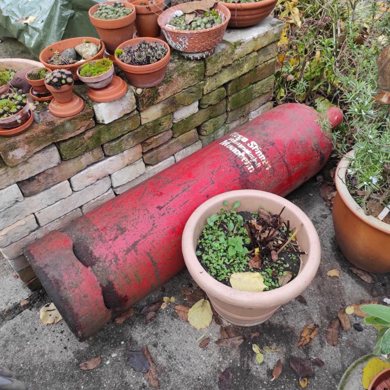 Entweder ist es ein Kampfmittel-Rest oder eine entsorgte Gasflasche und böse Buben wollten sie mit Unkrautsalz und Dieselöl aufsprengen. Täte Ich mir AUF KEINEN FALL in den Garten stellen.