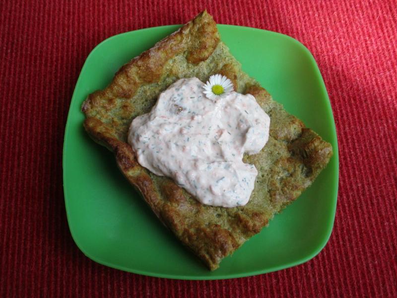 finnische Eierkuchen, diesmal Variante 'Brennnessel' mit Lachsquark