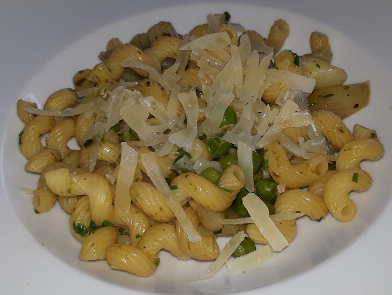 Pasta mit gebratenem Spargel, Erbsen, Bärlauch-Ghee und geraspeltem Manchego