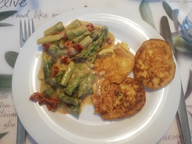 Heute gab es fleischlose Küche: Spargelragout und Polentaküchlein.